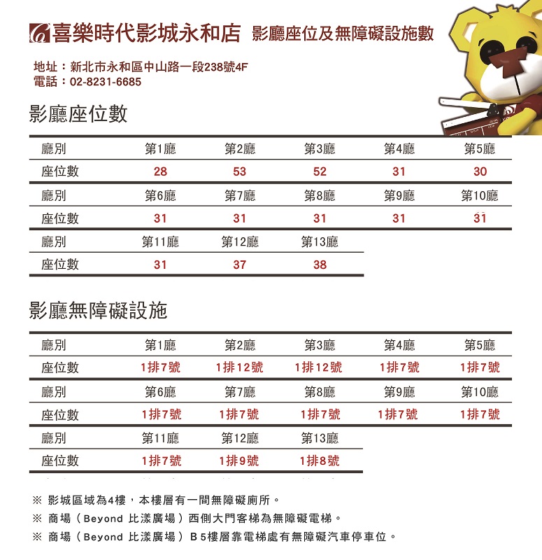 下一站•幸福 喜樂時代影城 永和店 住址:新北市永和區中山路一段238號4樓 電話:02-8231-6685 營業時間: 首場放映時間上午10:30~末場放映時間22:30 備註: 上述營業時間僅供參考,影城將依照實際電影首、末場放映時間機動調整營業時間 憑電影票可享P棟立體停車場免費停車三小時,每台車限折抵乙次,摩托車恕不適用本停車專案
